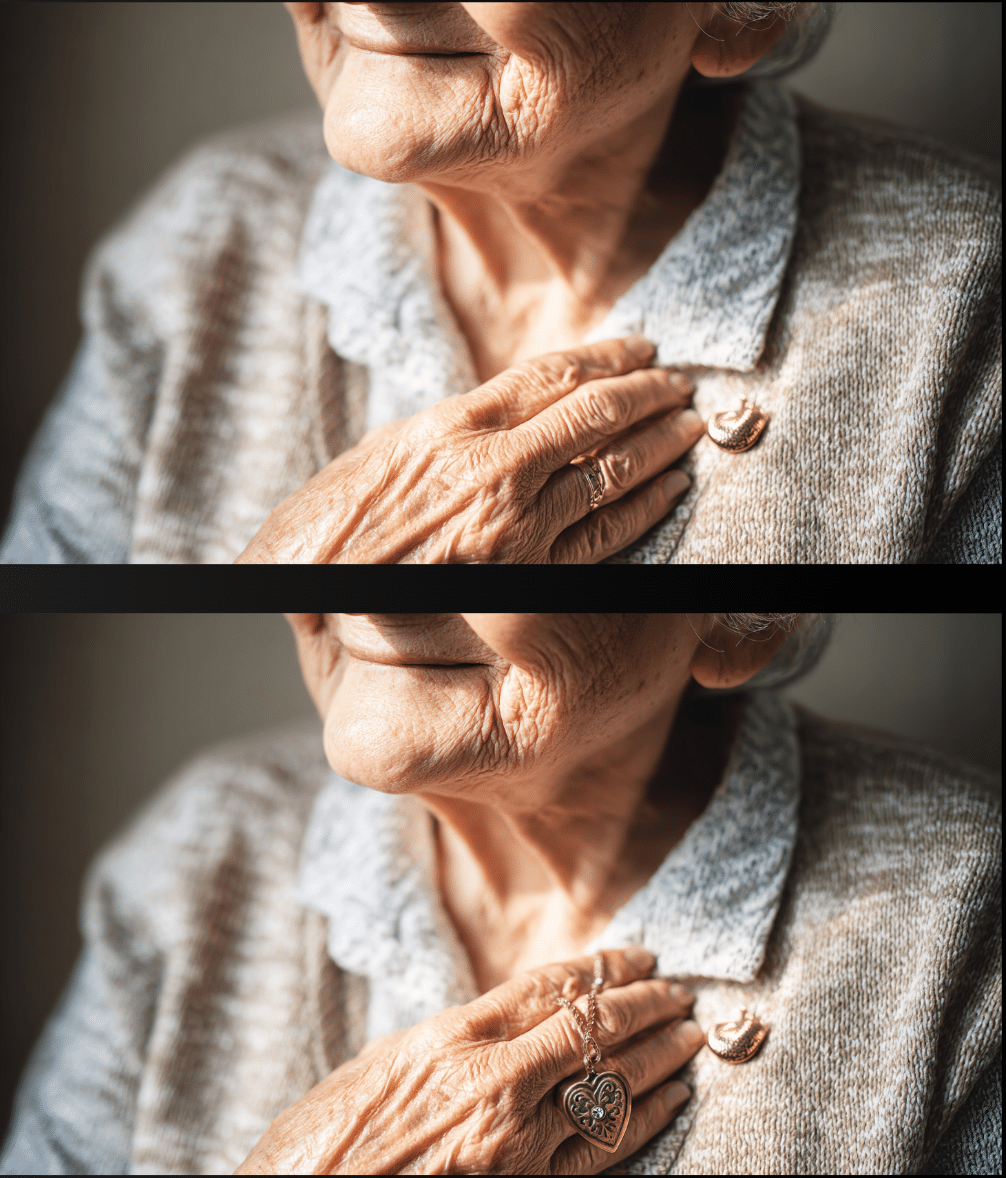 For the Cone Health video, we needed an emotional shot of an elderly woman holding a vintage locket. We started with a text-to-image prompt in Gemini and got a decent, if slightly “waxy,” result. So, we took that image to Midjourney, which is exceptional at creating photorealism and lighting. It returned a stunningly realistic portrait. But guess what? We lost our locket.