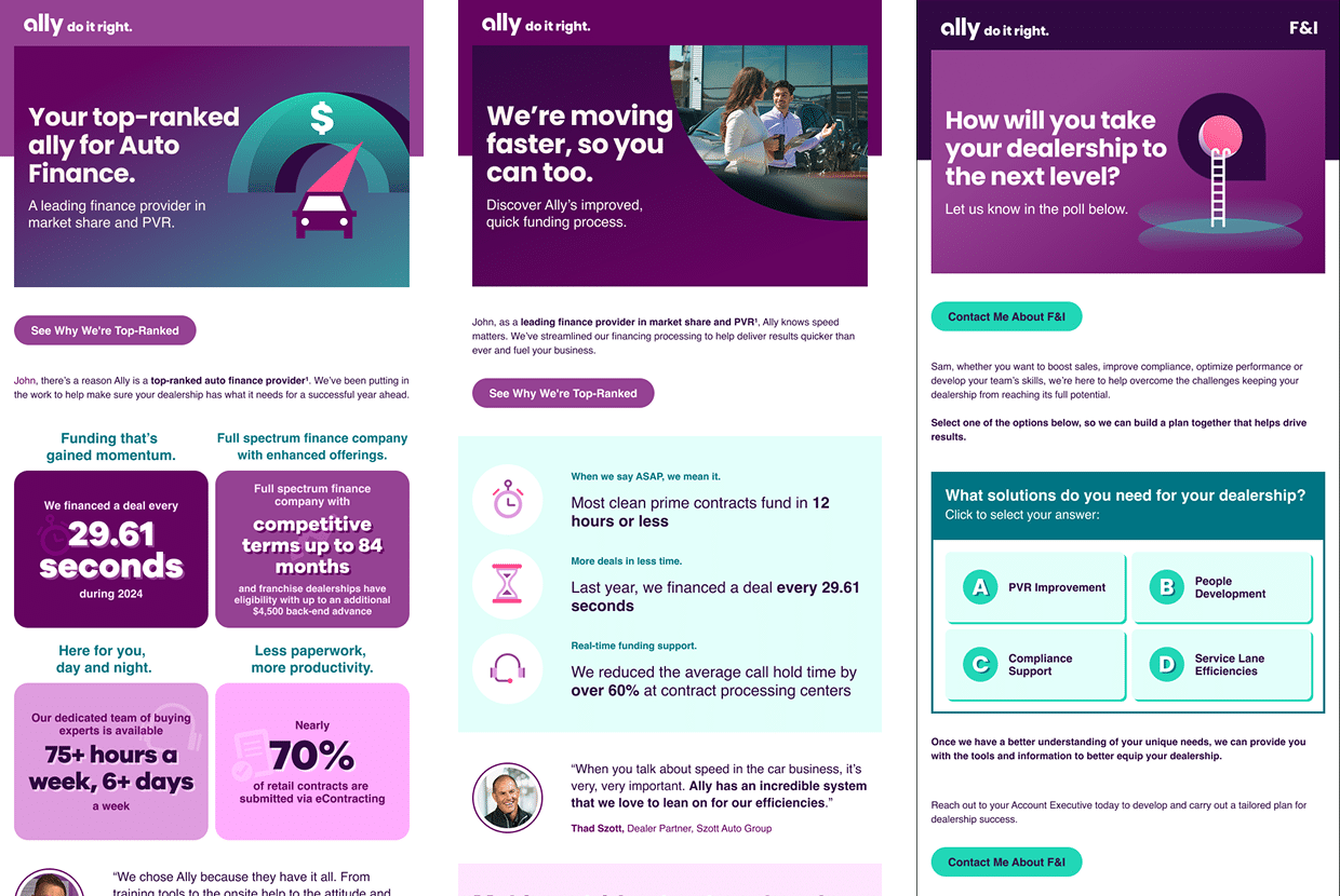When Ally Dealer Financial Services came to Mythic, they had one ask: move their CRM from data silos to actionable insights and create a unified brand story. We met the challenge with a hyper-personalized strategy, custom dealer website, and creative content that compelled automotive dealers to engage. By streamlining operations, we empowered Ally to cultivate stronger dealer relationships, boost brand awareness, and generate a significant volume of warm prospects, ultimately driving substantial business growth.
