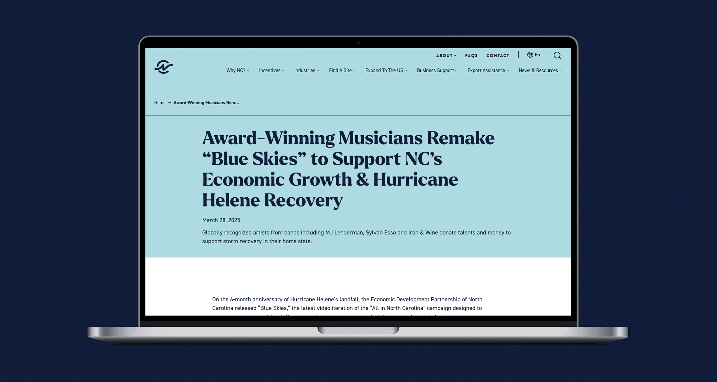 Six months after Hurricane Helene’s devastating waters rushed through Western North Carolina, we wanted to support the communities still rebuilding while reminding decision makers that most of North Carolina is open for business. To evolve the Economic Development Partnership of North Carolina (EDPNC) “All in NC” campaign, we captured the state’s 54,000 square miles of innovation, energy, hustle and possibility. Then, our team hatched a plan: record a cover of “Blue Skies” with NC-grown artists from bands like MJ Lenderman, Sylvan Esso and Iron & Wine. The song is an evocative reflection of Carolina resilience — and the backbone of our latest efforts to position North Carolina as the state for opportunity. The best part? Participating musicians donated a total of $100K to relief efforts.