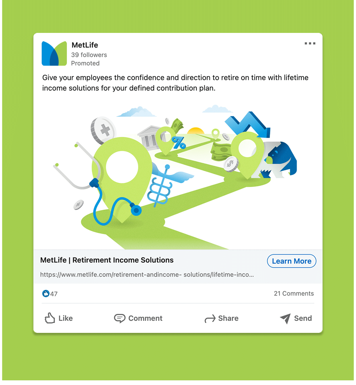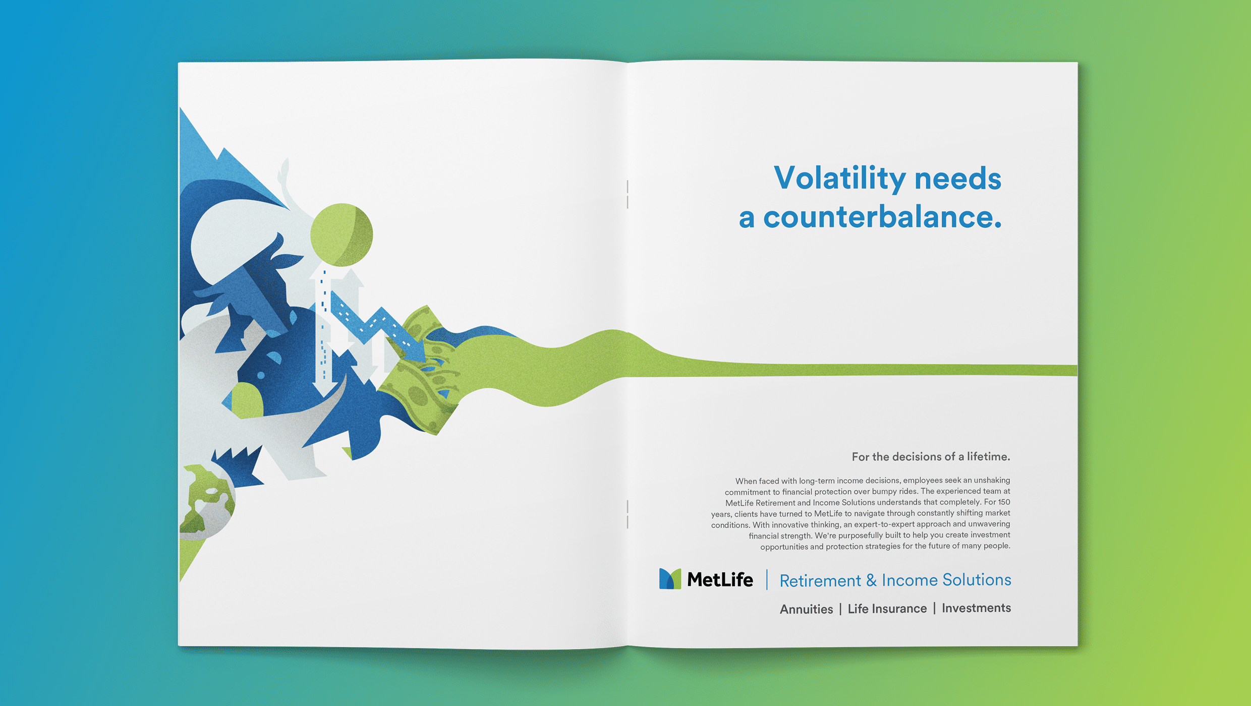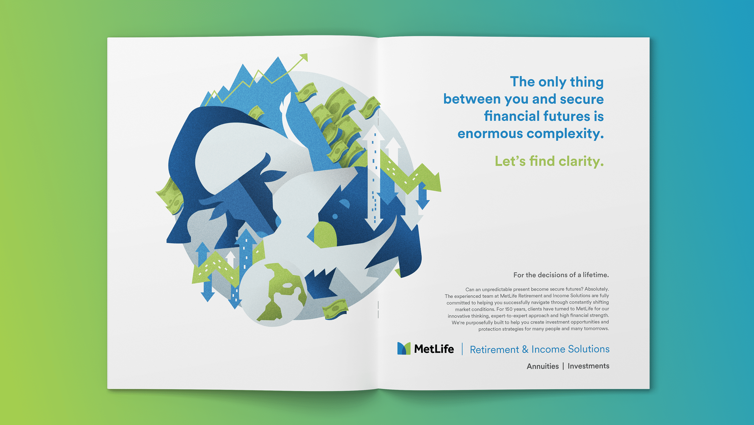 When the markets are uncertain, you need a trusted partner to see you through. Our goal: position MetLife Retirement & Income Solutions as that partner, the definitive antidote to a complex financial landscape. Through the use of custom illustrations and a bold articulation of the moment, we offered both a reality check and a solution: annuity and investment options from a legendary brand that’s never lost its edge.